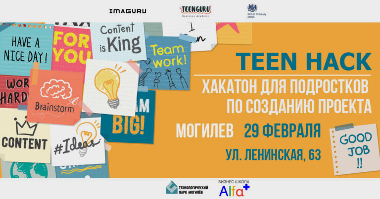 29 февраля 2020 TeenGuru Бизнес академия для подростков совместно с Технопарком Могилев, бизнес-школой Альфа Плюс при поддержке Посольства Великобритании в Республике Беларусь проведут Хакатон в Могилеве.
